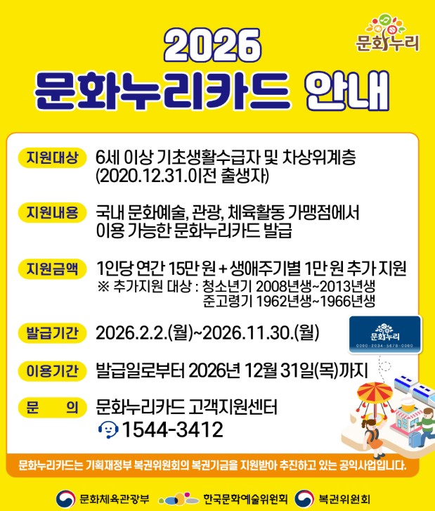 - 2026 문화누리카드는 2월 2일 시작, 11월 30일까지 발급, 12월 31일까지 사용!